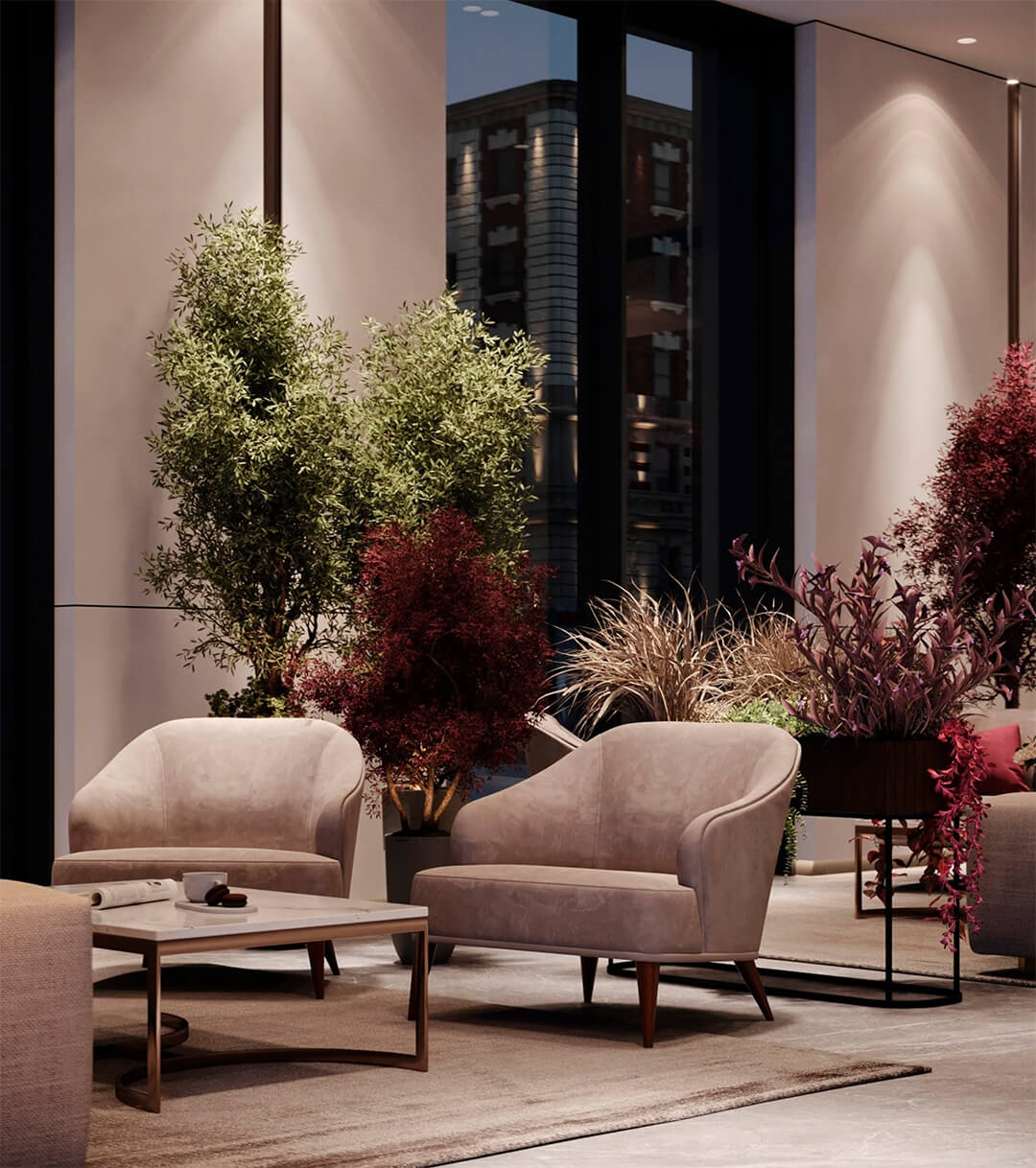 Продуманная архитектура распространяется и на внутренние пространства: входные группы с дизайнерским лобби, отделка натуральным камнем, деревом и керамикой, большие окна до пола – всё это создает ощущение простора, света и элегантности. Лаунж-зона в лобби помогает организовать встречи с гостями в непринуждённой атмосфере, а зоны ожидания с дизайнерскими решениями формируют настроение домашнего тепла на пороге дома.