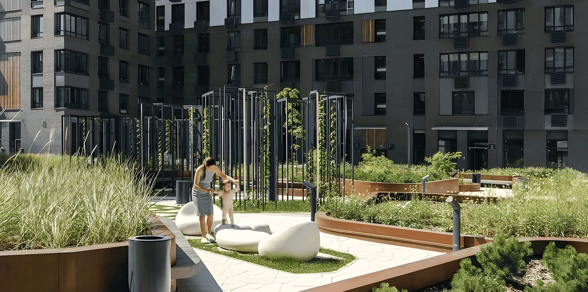 Зелёное озеленение выполнено с применением многолетних кустарников, газонов и сезонных растений, создающих сменяющийся природный пейзаж в течение всего года. Здесь можно проводить время с семьей, гулять с детьми, заниматься йогой или читать книгу в тишине городского оазиса. Умное уличное освещение и видеонаблюдение обеспечивают безопасность в вечерние часы, а система автоматического полива поддерживает здоровье зелёных насаждений. Территория благоустроена таким образом, чтобы каждый метр был функционален и визуально гармоничен.