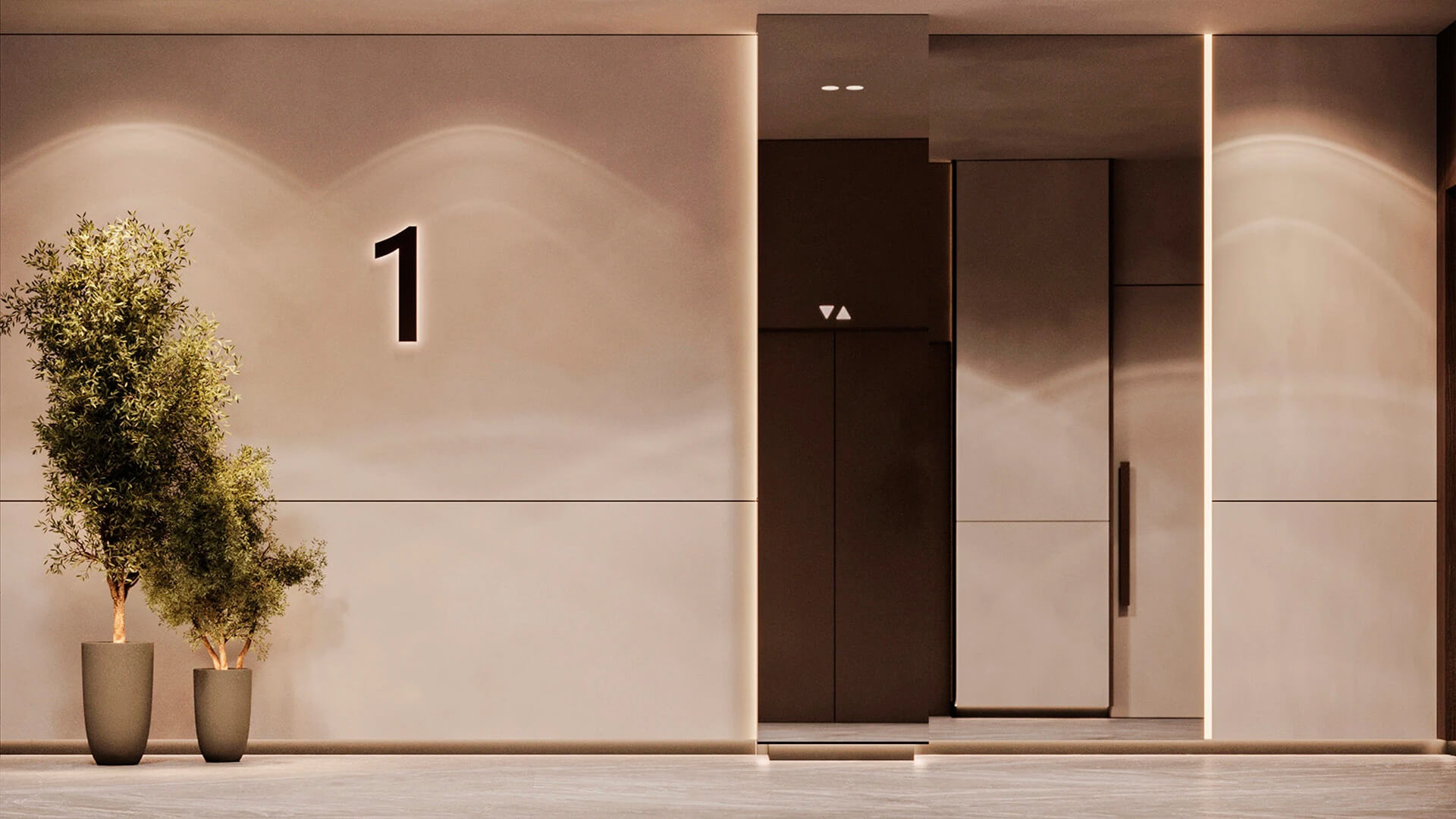 Материалы отделки тщательно подобраны для стойкости к износу и долгой службы: плитка, инженерное дерево, обивка тканей. Поверхности устойчивы к ежедневной нагрузке — это важно для жилой недвижимости премиум-уровня. Дизайн лобби также учитывает функциональность – здесь легко ориентироваться, а обилие естественного света создаёт ощущение открытости.